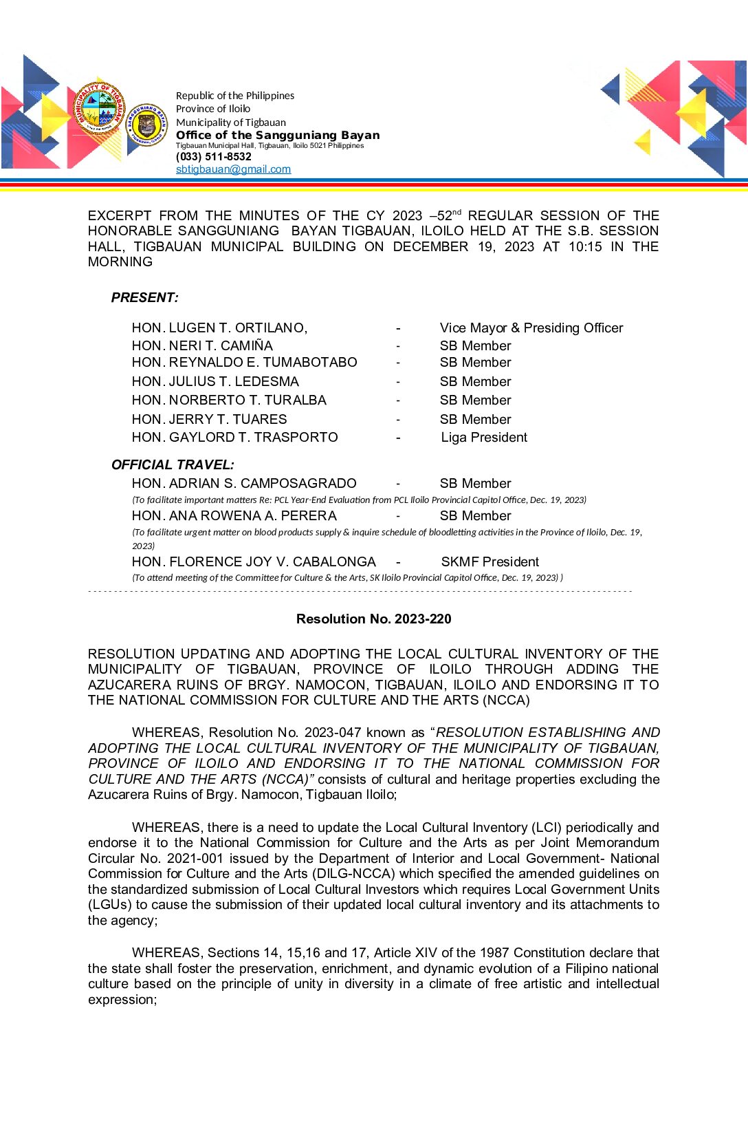 Resolution No. 2023-220 RESOLUTION UPDATING AND ADOPTING THE LOCAL CULTURAL INVENTORY OF THE MUNICIPALITY OF TIGBAUAN, PROVINCE OF ILOILO THROUGH ADDING THE AZUCARERA RUINS OF BRGY. NAMOCON, TIGBAUAN, ILOILO AND ENDORSING IT TO THE NATIONAL COMMISSION FOR CULTURE AND THE ARTS (NCCA)