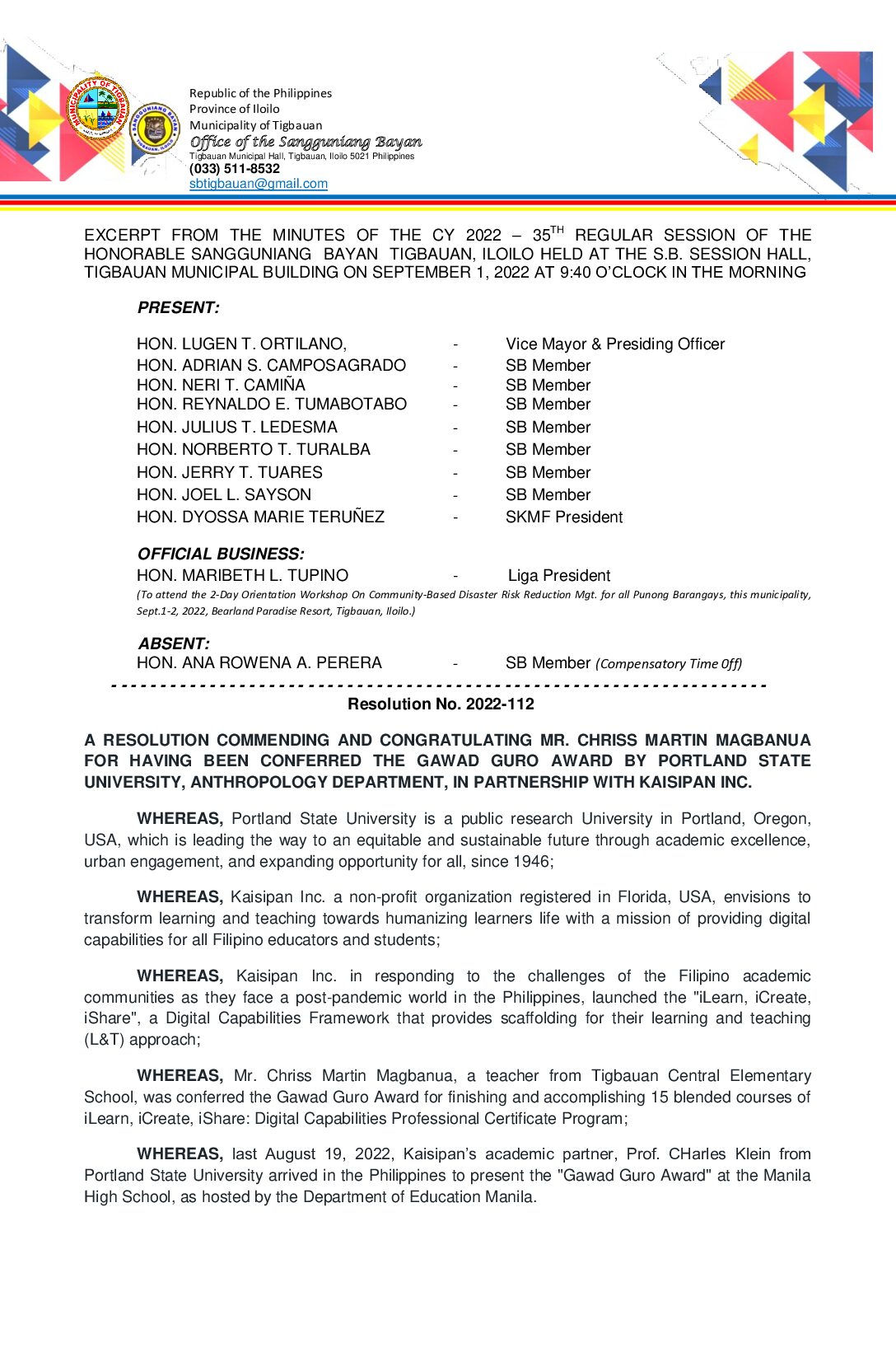 Resolution No. 2022-112 – RESOLUTION APPROVING AND GRANTING THE ACCREDITATION OF THE HEREIN LIST OF QUALIFIED CIVIL SOCIETY ORGANIZATIONS, COOPERATIVES, NON-GOVERNMENT ORGANIZATION AND SIMILAR AGGRUPATIONS/GROUPS IN THE MUNICIPALITY OF TIGBAUAN, PROVINCE OF ILOILO