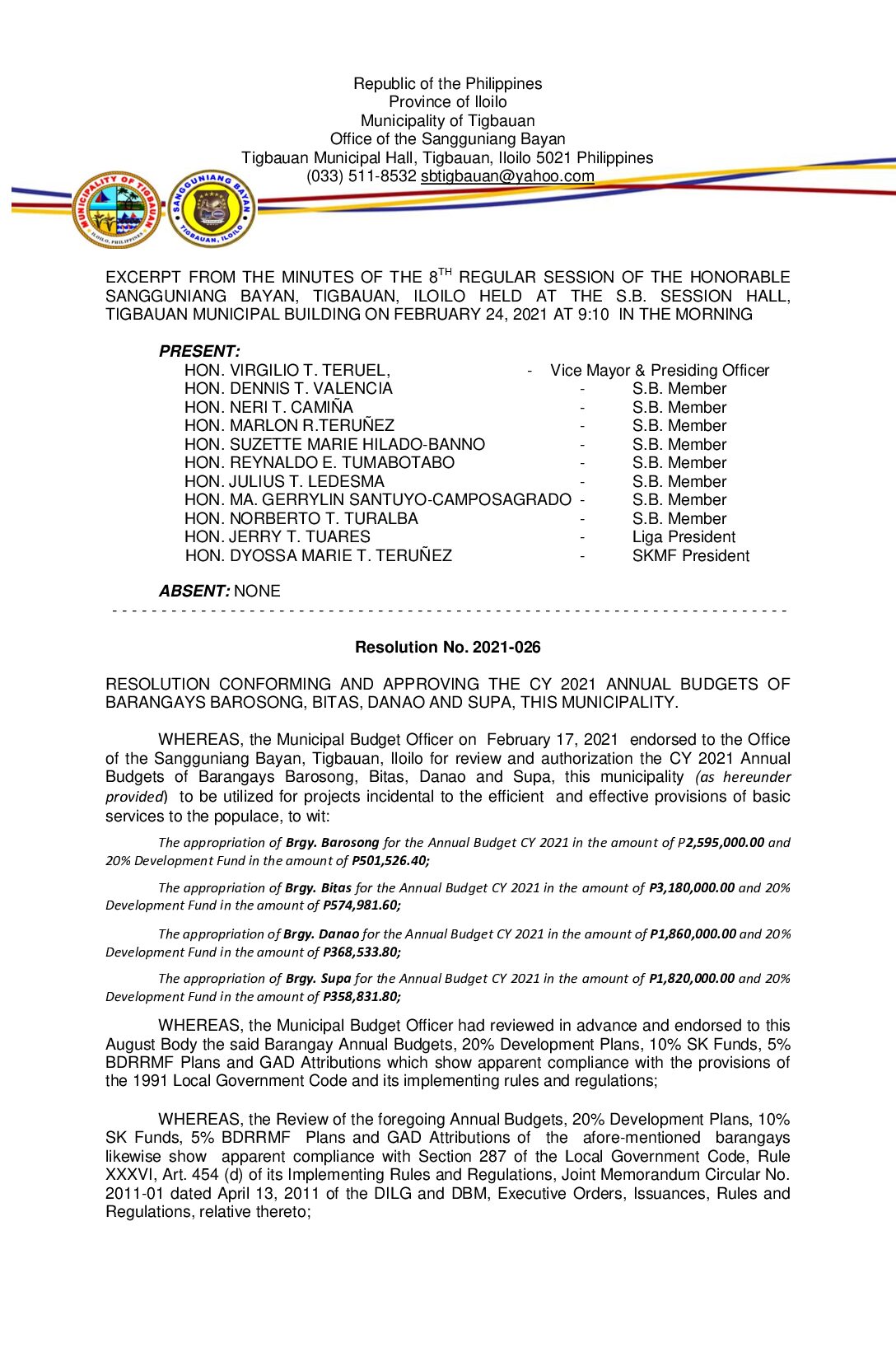 Resolution No. 2021-026 – RESOLUTION CONFORMING AND APPROVING THE CY 2021 ANNUAL BUDGETS OF BARANGAYS BAROSONG, BITAS, DANAO AND SUPA, THIS MUNICIPALITY.