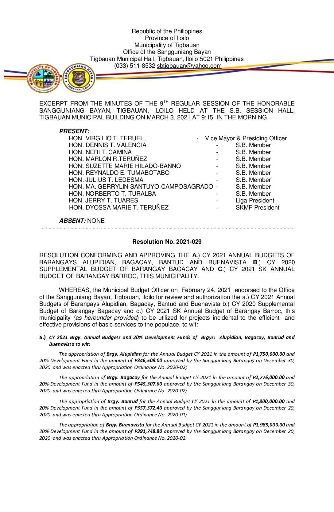 Resolution No. 2021-029 – RESOLUTION CONFORMING AND APPROVING THE A.) CY 2021 ANNUAL BUDGETS OF BARANGAYS ALUPIDIAN, BAGACAY, BANTUD AND BUENAVISTA B.) CY 2020 SUPPLEMENTAL BUDGET OF BARANGAY BAGACAY AND C.) CY 2021 SK ANNUAL BUDGET OF BARANGAY BARROC, THIS MUNICIPALITY.