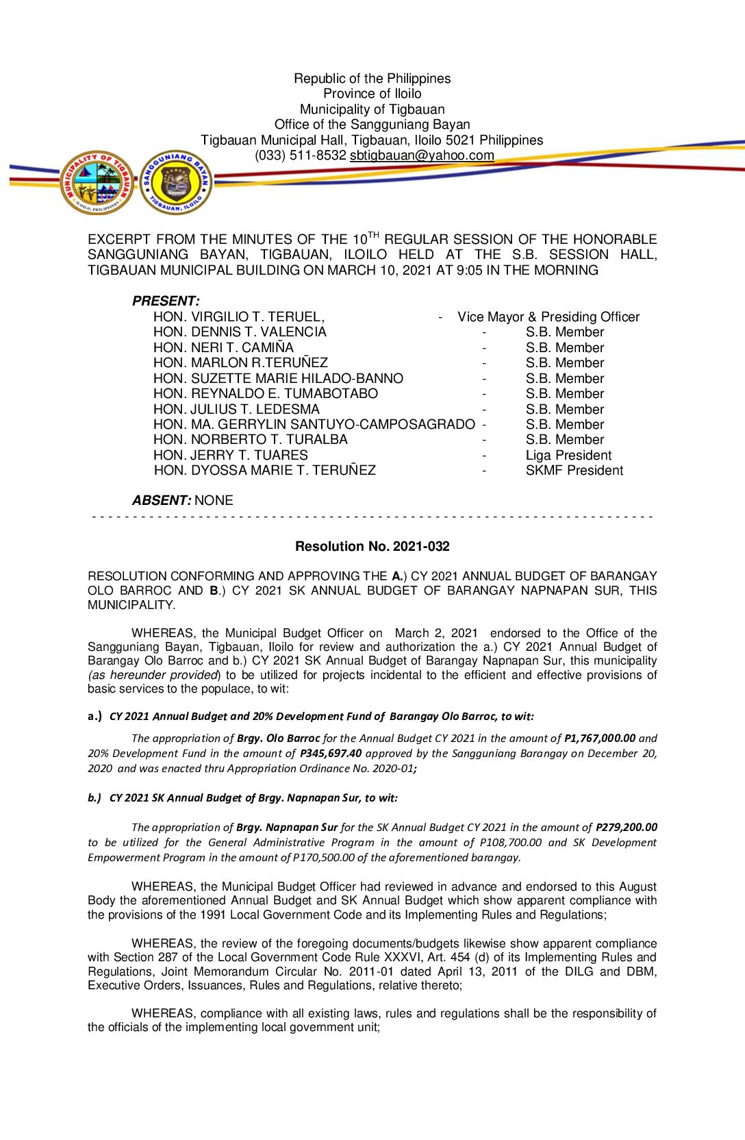 Resolution No. 2021-032 – RESOLUTION CONFORMING AND APPROVING THE A.) CY 2021 ANNUAL BUDGET OF BARANGAY OLO BARROC AND B.) CY 2021 SK ANNUAL BUDGET OF BARANGAY NAPNAPAN SUR, THIS MUNICIPALITY.