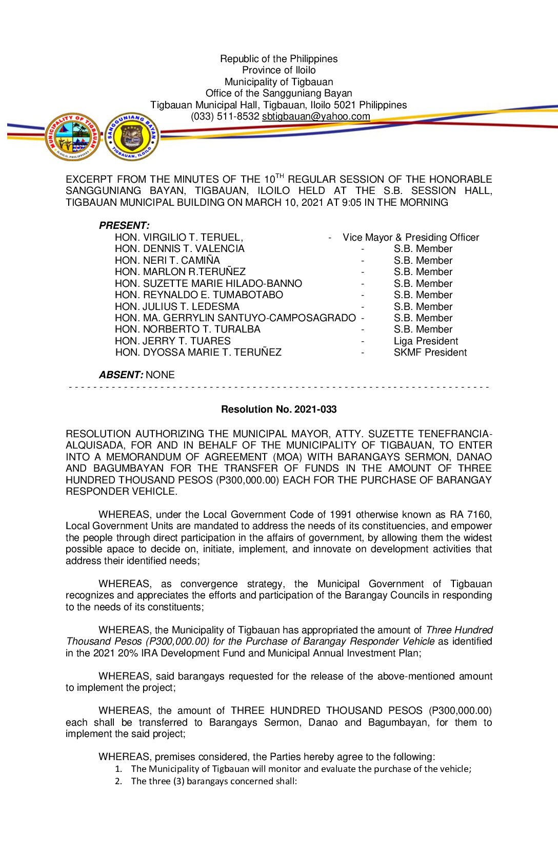 Resolution No. 2021-033 – Resolution No. 2021-033 RESOLUTION AUTHORIZING THE MUNICIPAL MAYOR, ATTY. SUZETTE TENEFRANCIA- ALQUISADA, FOR AND IN BEHALF OF THE MUNICIPALITY OF TIGBAUAN, TO ENTER INTO A MEMORANDUM OF AGREEMENT (MOA) WITH BARANGAYS SERMON, DANAO AND BAGUMBAYAN FOR THE TRANSFER OF FUNDS IN THE AMOUNT OF THREE HUNDRED THOUSAND PESOS (P300,000.00) EACH FOR THE PURCHASE OF BARANGAY RESPONDER VEHICLE.