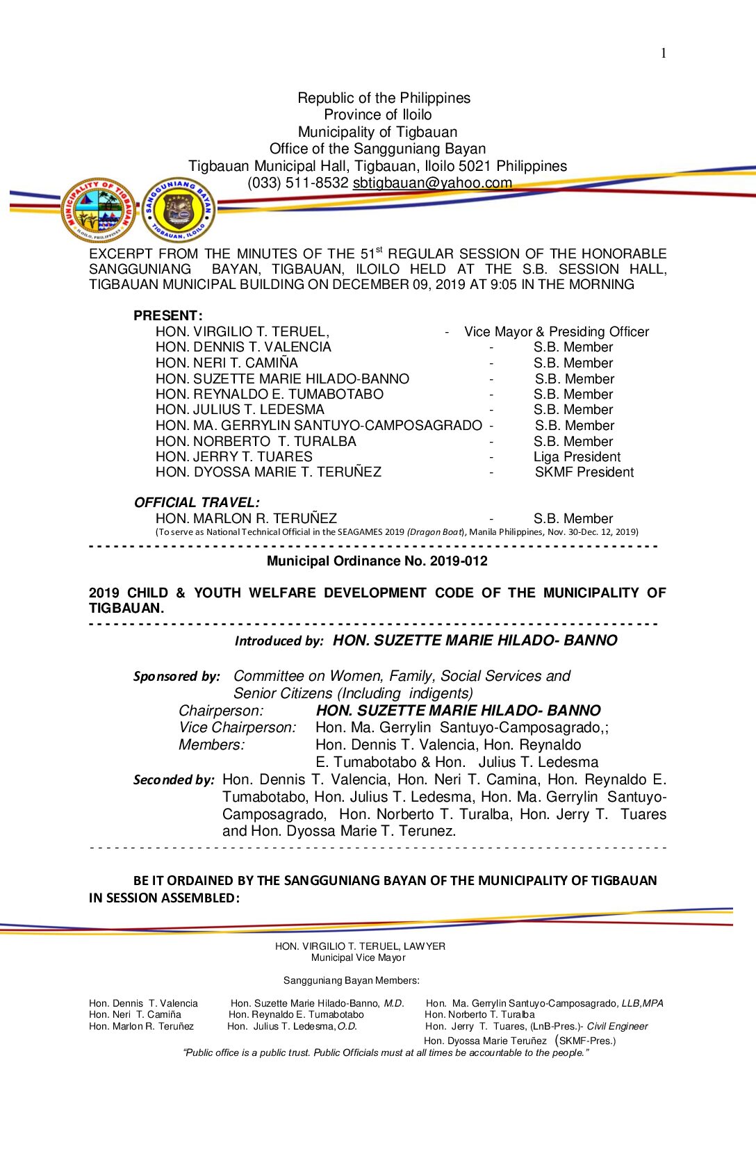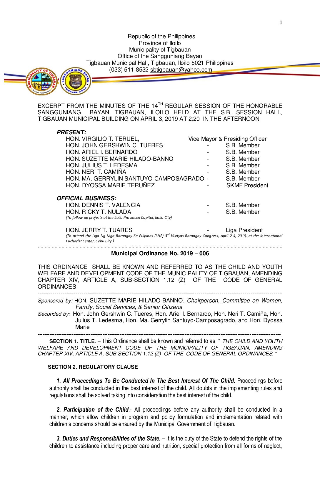 Municipal Ordinance No. 2019-006 – THIS ORDINANCE SHALL BE KNOWN AND REFERRED TO AS THE CHILD AND YOUTH WELFARE AND DEVELOPMENT CODE OF THE MUNICIPALITY OF TIGBAUAN, AMENDING CHAPTER XIV, ARTICLE A, SUB-SECTION 1.12 (Z) OF THE CODE OF GENERAL ORDINANCES