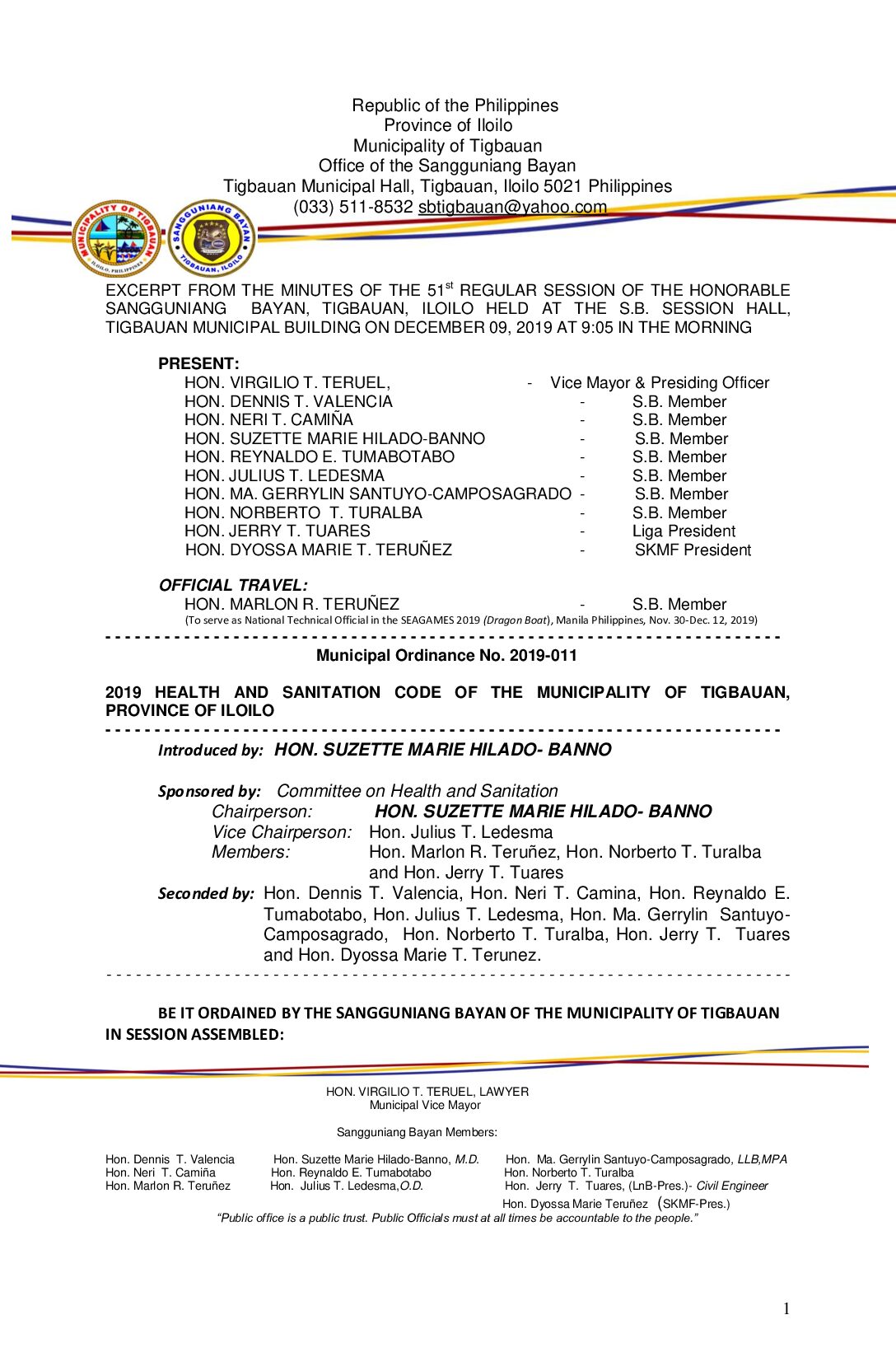 Municipal Ordinance No. 2019-011 – 2019 HEALTH AND SANITATION CODE OF THE MUNICIPALITY OF TIGBAUAN, PROVINCE OF ILOILO
