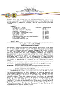April 25, 2018 admin Comment off File Type: pdf File Size: 1 MB Categories: ORDINANCES Tags: DEVELOPMENT PROJECTS, MAINTENANCE, MANDATORY OBLIGATIONS Author: Sangguniang Bayan of the Municipality of Tigbauan Share: Resolution No. 2018-061 Resolution No. 2018-063