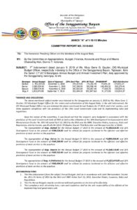 January 16, 2019 admin Comment off File Type: pdf File Size: 962 KB Categories: COMMITTEE REPORTS Tags: CY 2019 Barangays Annual Budget and Annual Investment Plan Author: HON. DENNIS T. VALENCIA rs_page_bg_color: Share: COMMITTEE REPORT NO. 2019-003 Resolution No. 2019-014 – RESOLUTION AMENDING RESOLUTION NO. 2018-126 BY RE-ORGANIZING THE COMPOSITION OF THE DIFFERENT S.B. STANDING COMMITTEES