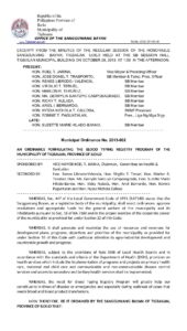 October 29, 2013 admin Comment off File Type: pdf File Size: 182 KB Categories: SB Ordinance Tags: BLOOD TYPING REGISTRY Author: Sangguniang Bayan ng Tigbauan rs_page_bg_color: Share: Municipal Ordinance No. 2013-003 Resolution No. 2013-082