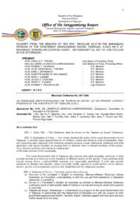 February 22, 2017 admin Comment off File Type: pdf File Size: 788 KB Categories: SB Ordinance Tags: KAARAM SA DUYAN Author: HON. MA. GERRYLIN SANTUYO-CAMPOSAGRADO Share: Resolution No. 2017-032 Resolution No. 2017-038