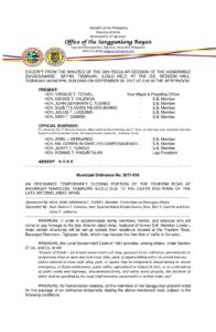 Municipal Ordinance No. 2017-016 – AN ORDINANCE TEMPORARILY CLOSING PORTION OF THE TOURISM ROAD AT BARANGAY NAMOCON, TIGBAUAN, ILOILO DUE TO THE DEATH AND WAKE OF THE LATE ANTONIO JABAT ARIAS