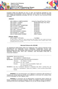 July 19, 2023 admin Comment off File Type: pdf File Size: 386 KB Categories: SB Ordinance Tags: FISH LANDING Author: HON. NORBERTO T. TURALBA rs_page_bg_color: Share: Municipal Ordinance No. 2023-010 Resolution No. 2023-098