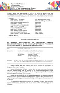 January 31, 2024 admin Comment off File Type: pdf File Size: 345 KB Categories: SB Ordinance Tags: PAGPAGAHUM SANG SANGGUNIAN Author: HON. ADRIAN CAMPOSAGRADO rs_page_bg_color: Share: Resolution No. 2024-017 Resolution No. 2024-014