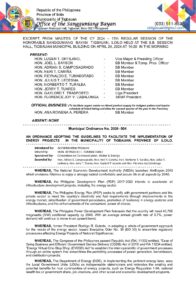 April 24, 2024 admin Comment off File Type: pdf File Size: 327 KB Categories: SB Ordinance Tags: IMPLEMENTATION OF ENERGY PROJECTS Author: HON. ANA ROWENA A. PERERA Share: Resolution No. 2024-048 Resolution No. 2024-050