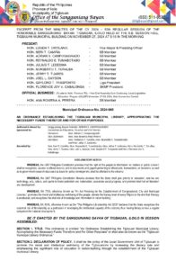 November 27, 2024 admin Comment off File Type: pdf File Size: 354 KB Categories: SB Ordinance Tags: ESTABLISHING THE TIGBAUAN MUNICIPAL LIBRARY Author: HON. ADRIAN CAMPOSAGRADO rs_page_bg_color: Share: Resolution No. 2024-185 Resolution No. 2024-190