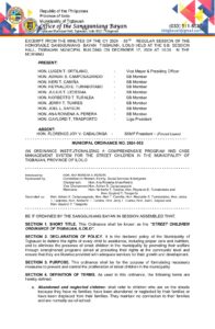 Municipal Ordinance No. 2024-052 – MUNICIPAL ORDINANCE NO. 2024-052 AN ORDINANCE INSTITUTIONALIZING A COMPREHENSIVE PROGRAM AND CASE MANAGEMENT SYSTEM FOR THE STREET CHILDREN IN THE MUNICIPALITY OF TIGBAUAN, PROVINCE OF ILOILO