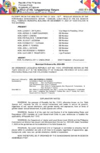 December 17, 2024 admin Comment off File Type: pdf File Size: 363 KB Categories: SB Ordinance Tags: REPUBLIC ACT NO. 11313, SAFE SPACES ACT Author: HON. ANA ROWENA A. PERERA rs_page_bg_color: Share: Municipal Ordinance No. 2024-046 Resolution No. 2024-200