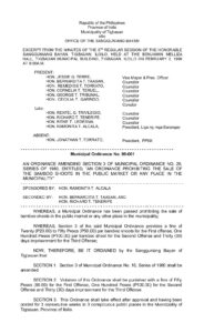 February 2, 1999 admin Comment off File Type: pdf File Size: 60 KB Categories: SB Ordinance Tags: BAMBOO SHOOTS Author: Sangguniang Bayan of the Municipality of Tigbauan rs_page_bg_color: Share: Resolution No. 99-016 Resolution No. 99-003