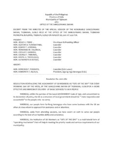 August 28, 2001 admin Comment off File Type: pdf File Size: 20 KB Categories: RESOLUTIONS Tags: REVITALIZING THE ASSIGNMENT OF SB MEMBERS AS “SB’S OF THE DAY” FOR EVERY WORKING DAY OF THE WEEK Author: Hon. Agaton Tumabotabo Share: Resolution No. 2001-084 Resolution No. 2001-083