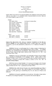 September 18, 2002 jaylord Comment off File Type: pdf File Size: 78 KB Categories: RESOLUTIONS Author: HON. ROMEO T. LEDESMA Share: Resolution No. 2002-095 Municipal Ordinance No. 2002-007