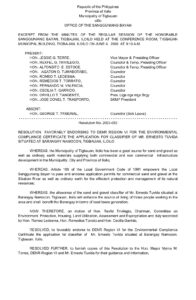 June 4, 2003 jaylord Comment off File Type: pdf File Size: 45 KB Categories: RESOLUTIONS Author: Hon. Rexfel Trivilegio Share: Resolution No. 2003-054 Resolution No. 2003-055