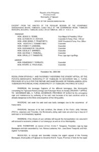 October 29, 2003 jaylord Comment off File Type: pdf File Size: 37 KB Categories: RESOLUTIONS Author: Hon. Orvillo T. Tengente Share: Resolution No. 2003-085 Resolution No. 2003-087
