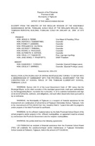 January 28, 2004 admin Comment off File Type: pdf File Size: 57 KB Categories: RESOLUTIONS Author: HON. AGATON O. TUMABOTABO Share: Resolution No. 2004-012 Resolution No. 2004-009