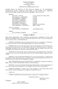 September 7, 2005 admin admin Comment off File Type: pdf File Size: 60 KB Categories: RESOLUTIONS Author: HON. SUZETTE ALQUISADA Share: Resolution No. 2005-076 Municipal Ordinance No. 2005-005