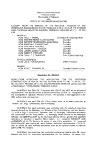 May 14, 2008 admin admin Comment off File Type: pdf File Size: 85 KB Categories: RESOLUTIONS Tags: RESOLUTION APPROVING THE APPLICATION FOR THE PROPOSED CONSTRUCTION OF SEA OIL FILLING STATION Author: HON. MARLON R. TERUÑEZ Share: Resolution No. 2008-038 Resolution No. 2008-040