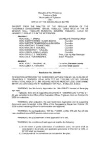 January 7, 2009 jin Comment off File Type: pdf File Size: 70 KB Categories: RESOLUTIONS Tags: RESOLUTION APPROVING THE SUBDIVISION APPLICATION Author: HON. MARLON R. TERUÑEZ Share: Resolution No. 2008-126 Appropriation Ordinance No. 2009-001