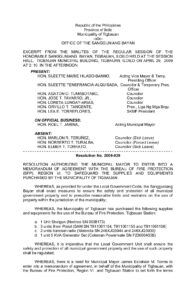 April 29, 2009 jin Comment off File Type: pdf File Size: 79 KB Categories: RESOLUTIONS Tags: RESOLUTION AUTHORIZING THE MUNICIPAL MAYOR TO ENTER INTO A MEMORANDUM OF AGREEMENT WITH THE BUREAU OF FIRE PROTECTION (BFP) Share: Resolution No. 2009-026 Resolution No. 2009-028