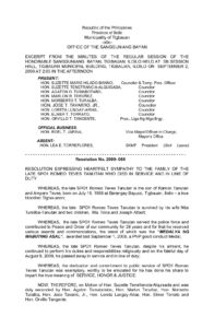September 2, 2009 jin Comment off File Type: pdf File Size: 79 KB Categories: RESOLUTIONS Tags: RESOLUTION EXPRESSING HEARTFELT SYMPATHY TO THE FAMILY OF THE LATE SPO1 ROMEO TEVES TANUTAN Author: HON. SUZETTE TENEFRANCIA-ALQUISADA Share: Resolution No. 2009-055 Resolution No. 2009-061