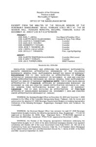 December 23, 2009 jin Comment off File Type: pdf File Size: 83 KB Categories: RESOLUTIONS Tags: RESOLUTION CONFORMING AND APPROVING THE BARANGAY SUPPLEMENTAL BUDGETS Author: HON. SUZETTE MARIE HILADO-BANNO Share: Resolution No. 2009-085 Appropriation Ordinance No. 2010-001