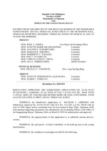 March 24, 2010 jin Comment off File Type: pdf File Size: 95 KB Categories: RESOLUTIONS Tags: RESOLUTION APPROVING THE SUBDIVISION APPLICATION Author: HON. MARLON R. TERUÑEZ Share: Resolution No. 2010-020 Resolution No. 2010-018