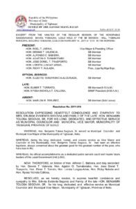 February 14, 2011 jin Comment off File Type: pdf File Size: 150 KB Categories: RESOLUTIONS Author: HON. ALFONSO BABIERA Share: Resolution No. 2011-015 Resolution No. 2011-018