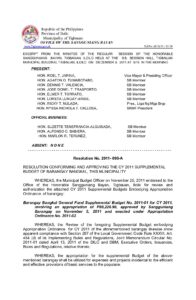 December 9, 2011 jin Comment off File Type: pdf File Size: 158 KB Categories: RESOLUTIONS Author: HON. JOSE DONEL T. TRASPORTO Share: Resolution No. 2011-102 Resolution No. 2011-101