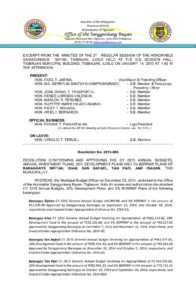 January 14, 2015 jin Comment off File Type: pdf File Size: 255 KB Categories: RESOLUTIONS Tags: RESOLUTION CONFORMING AND APPROVING THE CY 2015 Author: HON. JOSE DONEL T. TRASPORTO Share: Resolution No. 2015-007 Resolution No. 2015-011