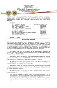 July 17, 2017 jaylord Comment off File Type: pdf File Size: 608 KB Categories: RESOLUTIONS Author: HON. MA. GERRYLIN SANTUYO-CAMPOSAGRADO Share: Resolution No. 2017-087 Appropriation Ordinance No. 2017-006 Supplemental Budget No. 2017-003