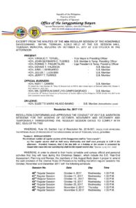 Resolution No. 2017-115 – RESOLUTION CONFORMING AND APPROVING THE CONDUCT OF 2017 S.B. MARATHON SESSIONS FOR THE MONTHS OF OCTOBER, NOVEMBER AND DECEMBER AND TEMPORARILY TRANSFERRING THE REGULAR SESSION DATES TO COMPLY WITH SEC. 52(A) OF RA 7160