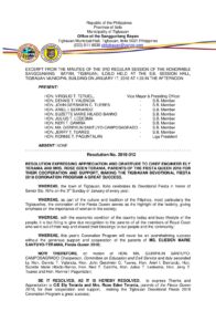 January 27, 2018 jaylord Comment off File Type: pdf File Size: 669 KB Categories: RESOLUTIONS Share: Resolution No. 2018-022 – RESOLUTION AUTHORIZING THE MUNICIPAL MAYOR, ATTY. SUZETTE TENEFRANCIA- ALQUISADA, FOR AND IN BEHALF OF THE MUNICIPALITY OF TIGBAUAN, TO SIGN THE PERFORMANCE COMMITMENT FOR HEALTH CARE INSTITUTIONS WITH PHILIPPINE HEALTH INSURANCE CORPORATION Resolution No. 2018-025 – RESOLUTION AUTHORIZING THE MUNICIPAL MAYOR, ATTY. SUZETTE TENEFRANCIA- ALQUISADA, FOR AND IN BEHALF OF THE MUNICIPALITY OF TIGBAUAN TO ENTER INTO A MEMORANDUM OF AGREEMENT WITH THE NATIONAL NUTRITION COUNCIL FOR THE IMPLEMENTATION OF DIETARY SUPPLEMENTATION PROGRAM (DSP) FOR PREGNANT WOMEN