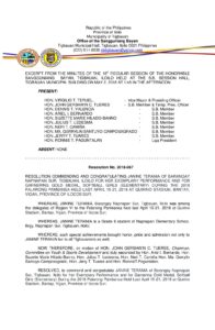 May 2, 2018 jaylord Comment off File Type: pdf File Size: 569 KB Categories: RESOLUTIONS Author: HON. JOHN GERSHWIN C. TUERES Share: Resolution No. 2018-063 Resolution No. 2018-068