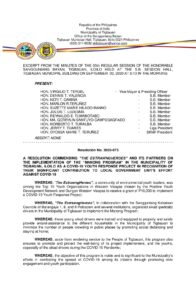 Resolution No. 2020-073 – A RESOLUTION COMMENDING “THE ESTRAWNGHEROES” AND ITS PARTNERS ON THE IMPLEMENTATION OF THE “MANONG PROGRAM” IN THE MUNICIPALITY OF TIGBAUAN, ILOILO AS A COVID-19 YOUTH RESPONSE PROJECT IN RECOGNITION OF THEIR SIGNIFICANT CONTRIBUTION TO LOCAL GOVERNMENT UNIT’S EFFORT AGAINST COVID-19