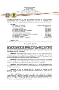 September 23, 2020 jaylord Comment off File Type: pdf File Size: 267 KB Categories: RESOLUTIONS Tags: ATTY. SUZETTE T. ALQUISADA, RESOLUTION AUTHORIZING THE MUNICIPAL MAYOR Author: HON. MA. GERRYLIN SANTUYO-CAMPOSAGRADO Share: Resolution No. 2020-076 COMMITTEE REPORT NO. 2020-036