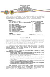 Resolution No. 2021-038 – RESOLUTION AUTHORIZING THE MUNICIPAL MAYOR, ATTY. SUZETTE TENEFRANCIA- ALQUISADA, FOR AND IN BEHALF OF THE MUNICIPALITY OF TIGBAUAN TO ENTER INTO AN ON-THE-JOB TRAINING AGREEMENT WITH THE RRLS ICT ACADEMY, ILOILO CITY FOR THE ON-THE-JOB TRAINING (OJT) PROGRAM FOR STUDENTS.