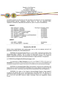 August 4, 2021 Pilar Manibog Comment off File Type: pdf File Size: 670 KB Categories: RESOLUTIONS Tags: CY 2021 SK ANNUAL BUDGET OF BARANGAY DORONG-AN Author: HON. DENNIS T. VALENCIA rs_page_bg_color: Share: Resolution No. 2021-079 – RESOLUTION AUTHORIZING THE MUNICIPAL MAYOR, ATTY. SUZETTE T. ALQUISADA, FOR AND IN BEHALF OF THE MUNICIPALITY OF TIGBAUAN TO ENTER INTO A MEMORANDUM OF AGREEMENT WITH THE DEPARTMENT OF SOCIAL WELFARE AND DEVELOPMENT FOR THE PROVISION OF ASSISTANCE TO INDIVIDUALS AND FAMILIES IN CRISIS SITUATION ”AICS” DUE TO THE DECLARATION OF LOCALIZED ENHANCED COMMUNITY QUARANTINE TO GOVERN THE DISTRIBUTION OF CASH ASSISTANCE REFERRED TO AS “SPECIAL AICS”, TO THE INDIVIDUALS AND FAMILIES WHO ARE RESIDING OR ARE FOUND IN THE PROVINCE, CITY OR MUNICIPALITY DECLARED UNDER LOCALIZED ECQ”. Resolution No. 2021-084 – RESOLUTION CONFORMING AND APPROVING THE CY 2021 SUPPLEMENTAL BUDGET OF BARANGAY 1 (POBLACION), THIS MUNICIPALITY.