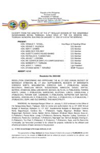 January 12, 2022 Pilar Manibog Comment off File Type: pdf File Size: 862 KB Categories: RESOLUTIONS Tags: RESOLUTION CONFORMING AND APPROVING THE A.) CY 2022 ANNUAL BUDGET OF BARANGAY ATABAYAN; B.) CY 2021 SUPPLEMENTAL BUDGETS OF BARANGAYS Author: HON. DENNIS T. VALENCIA rs_page_bg_color: Share: Resolution No. 2022-003 – RESOLUTION DECLARING JANUARY 22 OF EVERY YEAR AS OCA GARIN REMEMBRANCE DAY IN THE MUNICIPALITY OF TIGBAUAN AND IMPLORING THE SUPPORT OF THE SANGGUNIANG PANLALAWIGAN, THROUGH BOARD MEMBER MARCELO VALENTINE SERAG, TO ENACT AN ORDINANCE DECLARING SUCH DATE AS OCA GARIN DAY IN THE FIRST DISTRICT OF ILOILO Resolution No. 2022-001 – RESOLUTION EXPRESSING HEARTFELT CONDOLENCES AND SYMPATHY TO THE FAMILY OF THE LATE, HON. JUAN CORBET GEOLAMIN, JR., BARANGAY KAGAWAD OF BARANGAY 3 POBLACION, MUNICIPALITY OF TIGBAUAN, PROVINCE OF ILOILO