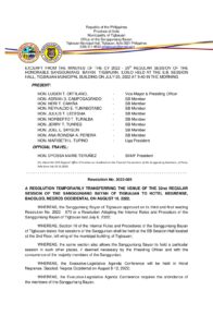 Resolution No. 2022-085 – A RESOLUTION TEMPORARILY TRANSFERRING THE VENUE OF THE 32nd REGULAR SESSION OF THE SANGGUNIANG BAYAN OF TIGBAUAN TO HOTEL NEGRENSE, BACOLOD, NEGROS OCCIDENTAL ON AUGUST 10, 2022.