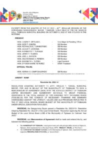October 5, 2022 admin Comment off File Type: pdf File Size: 302 KB Categories: RESOLUTIONS Tags: TRAININGS AND SEMINARS Author: HON. ANA ROWENA A. PERERA rs_page_bg_color: Share: Resolution No. 2022-142 Resolution No. 2022-136