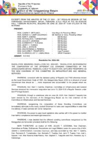 Resolution No. 2024-100 – RESOLUTION AMENDING RESOLUTION NO. 2024-001 – RESOLUTION REORGANIZING THE COMPOSITION OF THE DIFFERENT S.B STANDING COMMITTEES OF THE SANGGUNIANG BAYAN, TIGBAUAN , ILOILO” TO ELECT HON. GAYLORD TRASPORTO AS THE NEW CHAIRMAN OF THE COMMITTEE ON SNFRASTRUCTURE AND GENERAL SERVICES