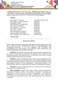 July 17, 2024 admin Comment off File Type: pdf File Size: 283 KB Categories: RESOLUTIONS Tags: BAN OF SINGLE-USE-PLASTIC AND STYROFOAM PRODUCTS Author: HON. NERI T. CAMIÑA rs_page_bg_color: Share: Resolution No. 2024-118 Resolution No. 2024-120