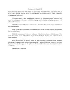 October 26, 1992 admin Comment off File Type: pdf File Size: 26 KB Categories: RESOLUTIONS Author: Hon. Cornelia T. Teruel Share: Resolution No. 92-034 Resolution No. 92-098