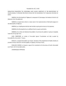 October 26, 1992 admin Comment off File Type: pdf File Size: 26 KB Categories: RESOLUTIONS Author: Hon. Agaton Tumabotabo Share: Resolution No. 92-046 Resolution No. 92-017